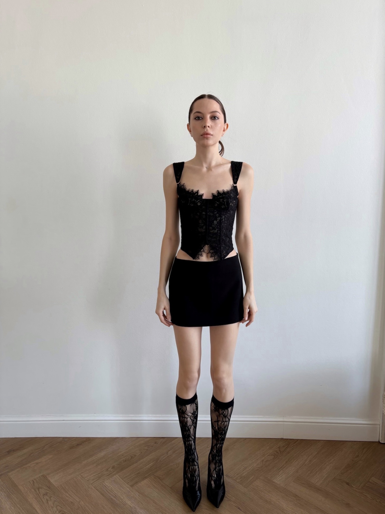 Мини на бедрах. Она сидит низко, на бедрах, — чуть расслабленно, чуть дерзко. Мягкий матовый хлопок с эластаном повторяет каждый изгиб, но не сковывает. А подкладка — легкая, почти невесомая — позволяет забыть, что юбка вообще есть. Только вы, город, и ритм музыки. Носите юбку с кружевным корсетом или любым другим верхом.